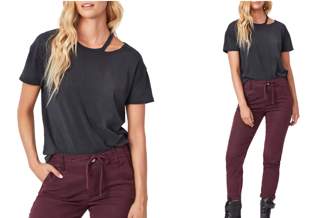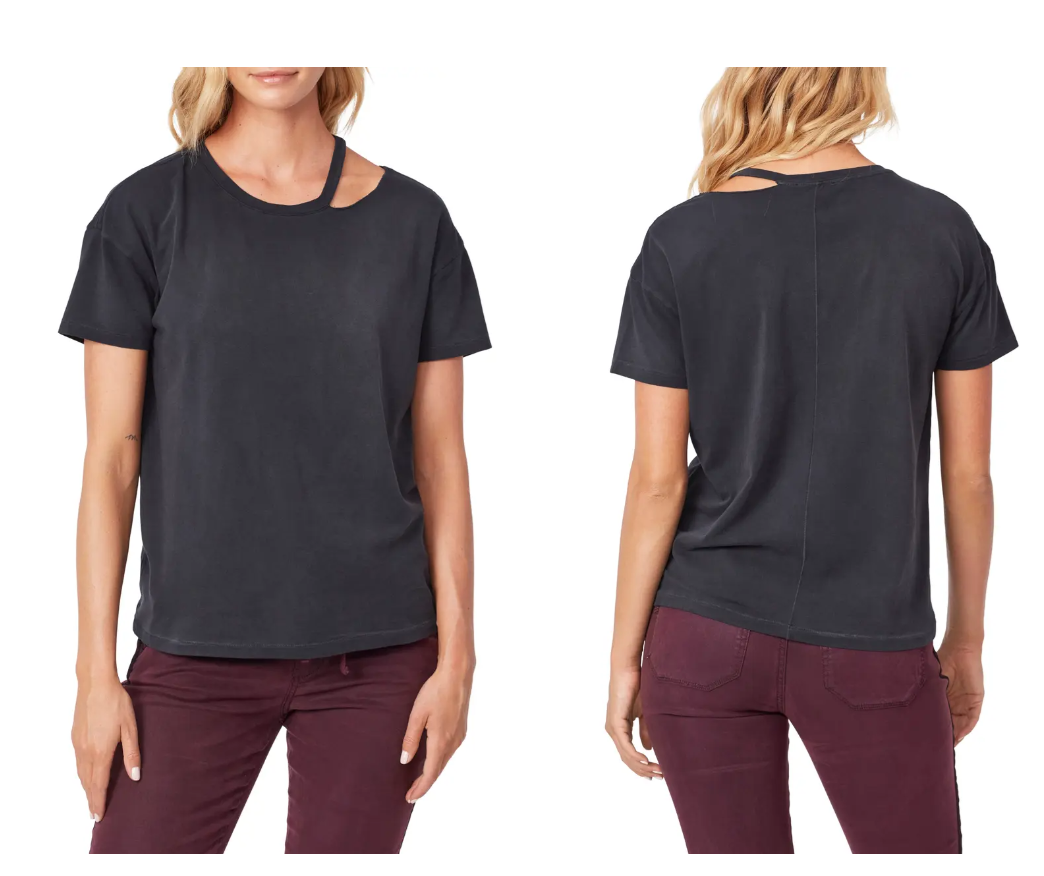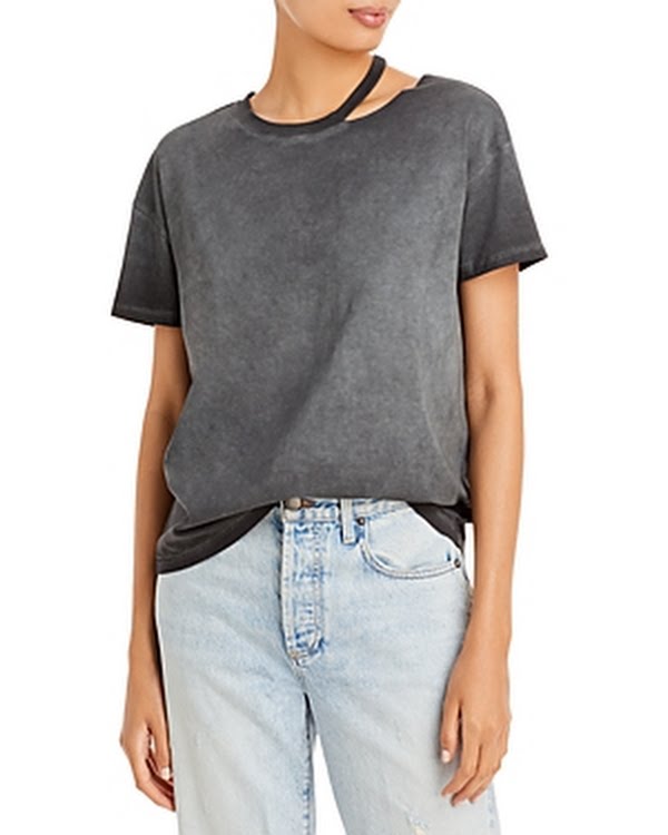 Made from a comfortable cotton blend, this go-to T-shirt is intentionally distressed at the collar to add a rugged, relaxed feel. 24 1/2 length (size Medium) Crewneck Short sleeves 95% cotton, 5% spandex Machine wash, tumble dry Imported Womens Clothing.Due to variances in monitor color, and lighting, the color of some items may differ slightly from the photographs