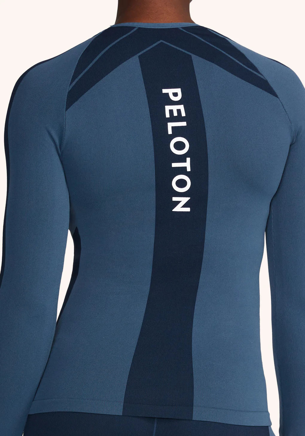 Seamless crewneck long sleeve 93% Nylon 7%Spandex Machine wash cold. Tumble dry low Peloton stamp reading at center back Imported Size and Fit: Tight Fit: Meant to fit close to the body Chinwendu is 5’11” height, 36” bust, 29” waist, 40” hip, wearing a size M Instructor Rebecca Kennedy wearing a size S