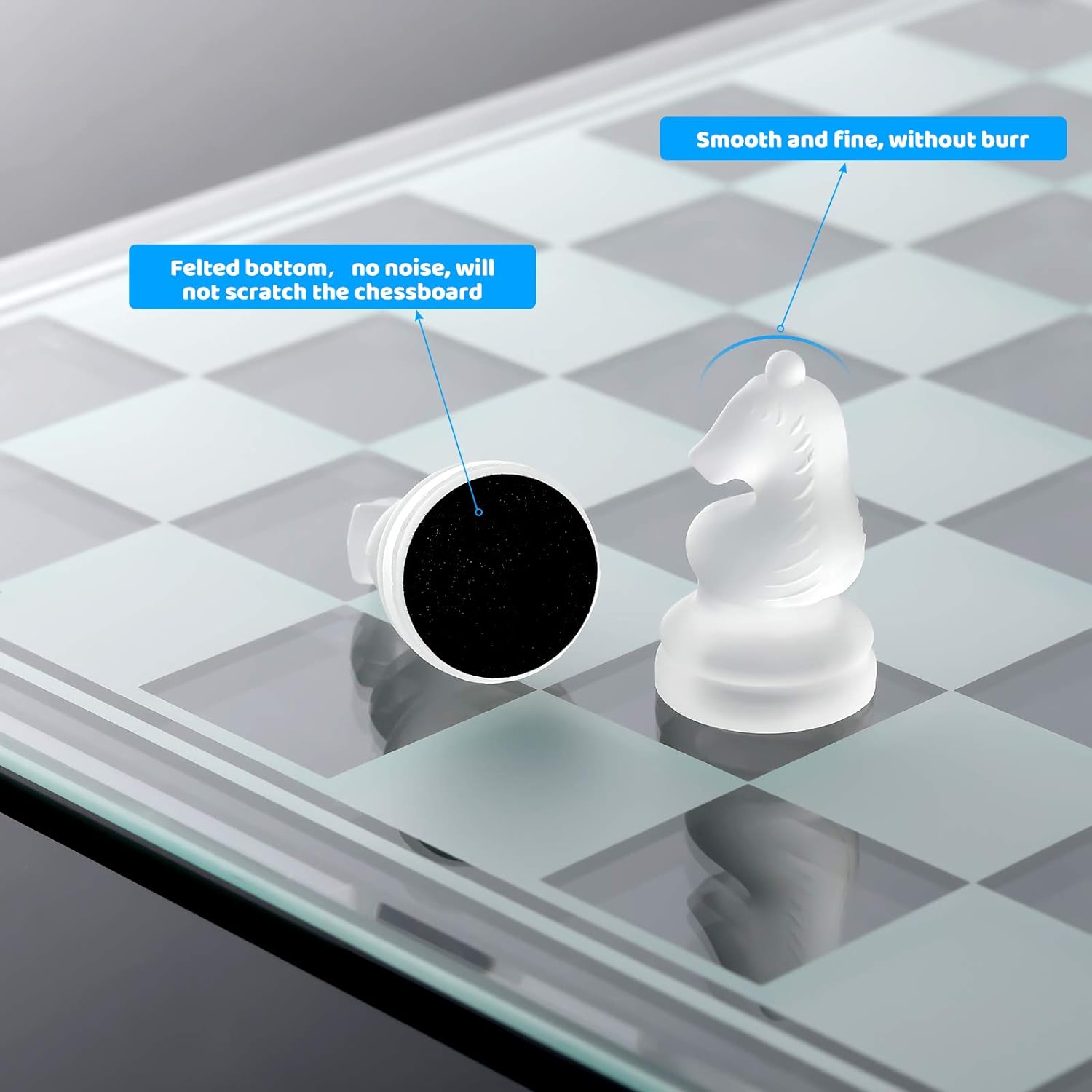 Glass Chess Set: This Elegant Glass Chess Set includes both smoked and clear glass chess pieces and a glass chess board. Board measures 9.75 by 9.75. For ages 8+.