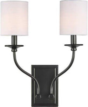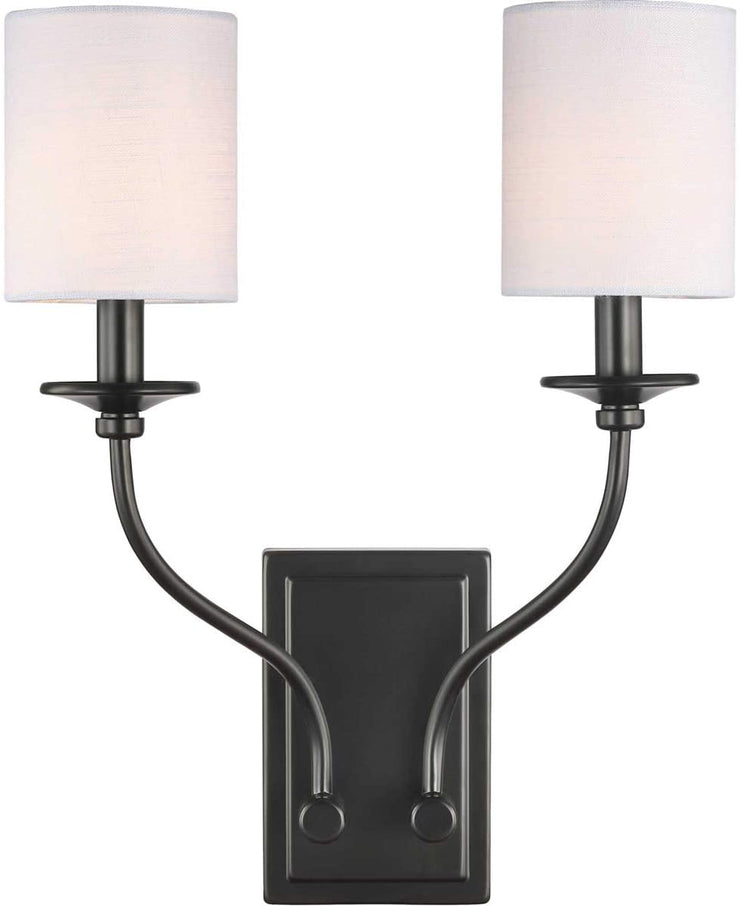 Inspired at its roots by an understated beauty and a breathtaking formal elegance, this wall sconce will make a stunning addition to any luxurious living space. Black arms flow down from ornamental light bases to a rectangular backplate. On top of the light bases sit summer linen shades. Ideal for any bedroom, living room, sitting room, hallway, or foyer. Perfect for transitional, modern, farmhouse, contemporary, or luxury settings. Measures 13-5/8-inch width by 17-1/4-inch height. Uses two candelabra base bulbs that are sold separately (40w max - LED or incandescent).
