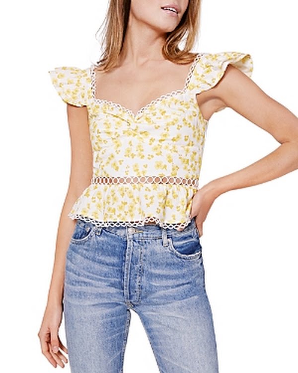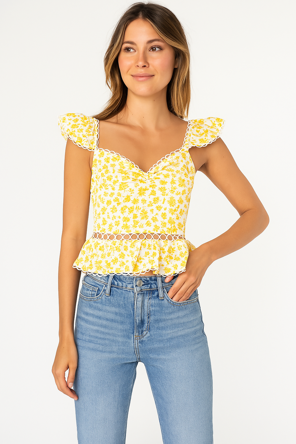 Fits true to size, order your normal size Model measurements: 510 height, 33.5 bust, 23.5 waist, 34.5 hips, wearing a size small Sweetheart neckline Zipper closure at side Ruffled cap sleeves Eyelet trim at hem, neckline and waist Smocked back Floral print Ruffled hem Lined Made in India MATERIAL & CARE Shell & lining: Cotton Hand wash