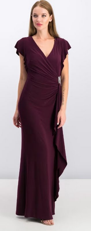 Scarlet Red Embellished Flutter-Sleeve Gown - Women. A dazzling rhinestone accent and cascading flutter sleeves dial up the glam-factor of this floor-sweeping gown that will have you sparkling and shining the way through your next special occasion. silhouette Pull-on styling Surplice neckline Flutter sleeves Bust darts Rhinestone pin accent Ruffle details at left waist Lined to the knee Polyester / elastane Dry clean Imported.