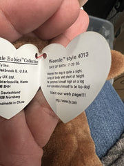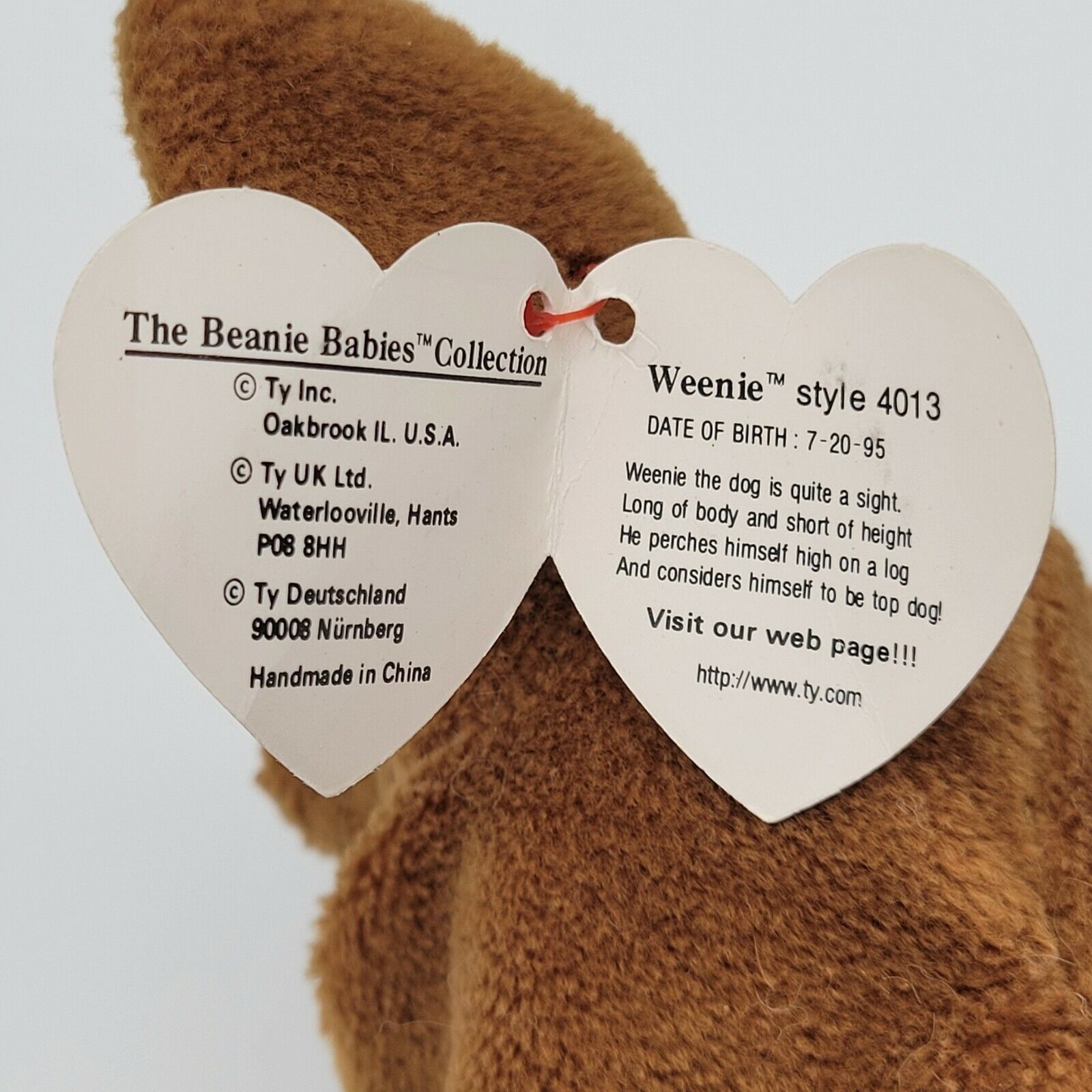 Weenie is a part of the Ty Beanie Babies product line. This plush toy comes with all its original tags in mint condition. Snag Weenie today! It s the perfect Dog to give your kids your friends or a TY collector. Great for Birthdays Easter Baskets Christmas gifts and more!