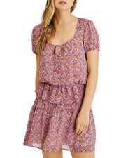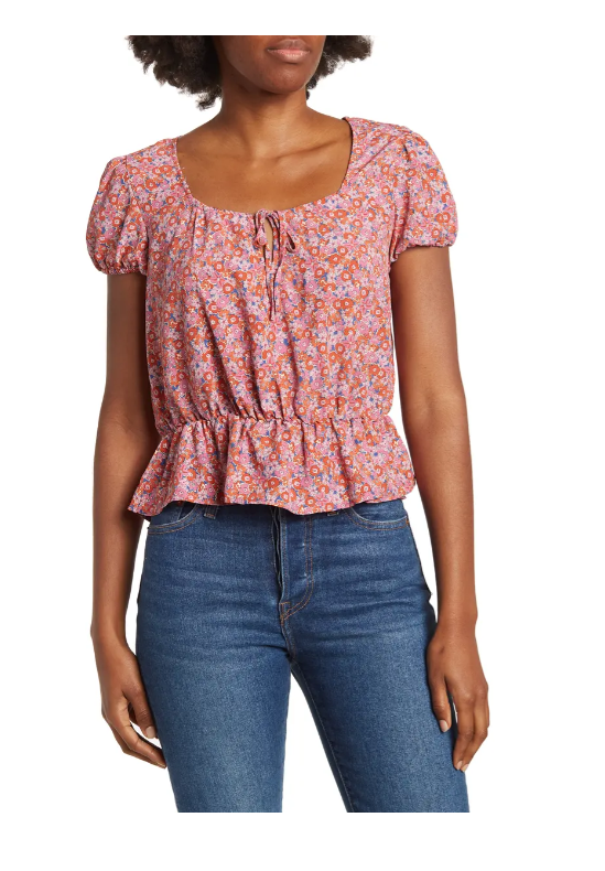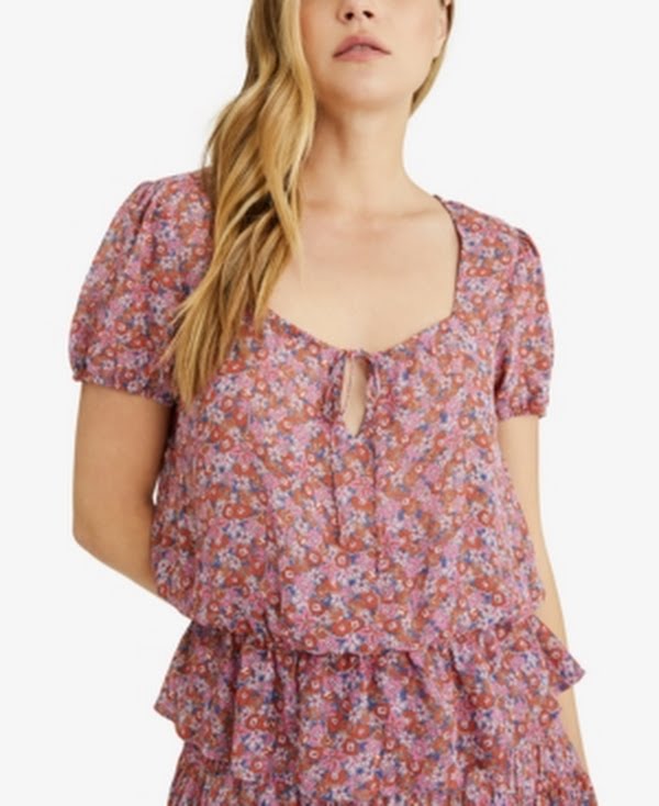 Sanctuary Womens Meet You There Top. Blossoming with florals, this top from Sanctuary is garnished with a cinched hem that ruffles and flirty puff sleeves. A square tie neck, short puff sleeves and a slight peplum hem eludes to the feminine appeal of this blouse. Scoop neck with tie Short sleeves All-over print Woven 100% polyester Machine wash cold Imported Model stats: 510, 32 bust, 25 waist, 36 hip. Model is wearing size S. Item #7046800Box H61 (XS/Meadow Ditsy Length:-1)