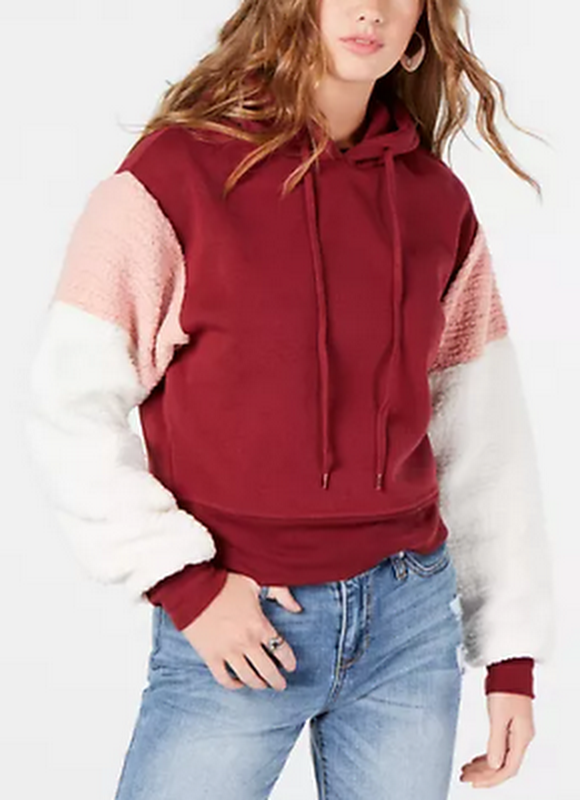 Self Esteems classic pullover sweatshirt with rib-knit trim gets a fashionable update with fabulous colorblocked faux-fur sleeves. Approx. model height is 59-1/2 and she is wearing a size medium Relaxed fit; hits at waist Attached self hood with drawstrings Rib-knit trim at cuffs and hem Long colorblocked faux-fur sleeves Body: polyester/spandex; arms: polyester Machine washable Imported
