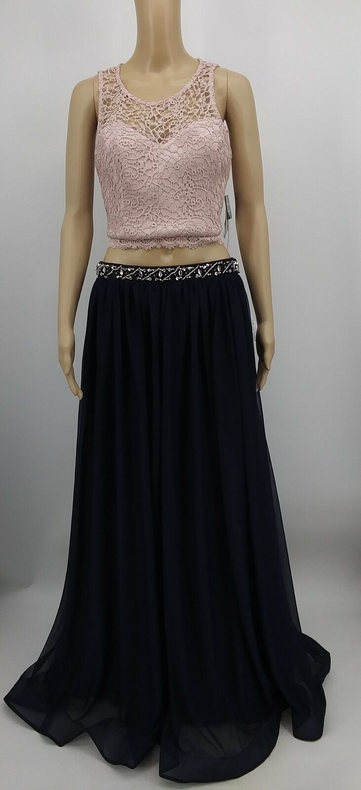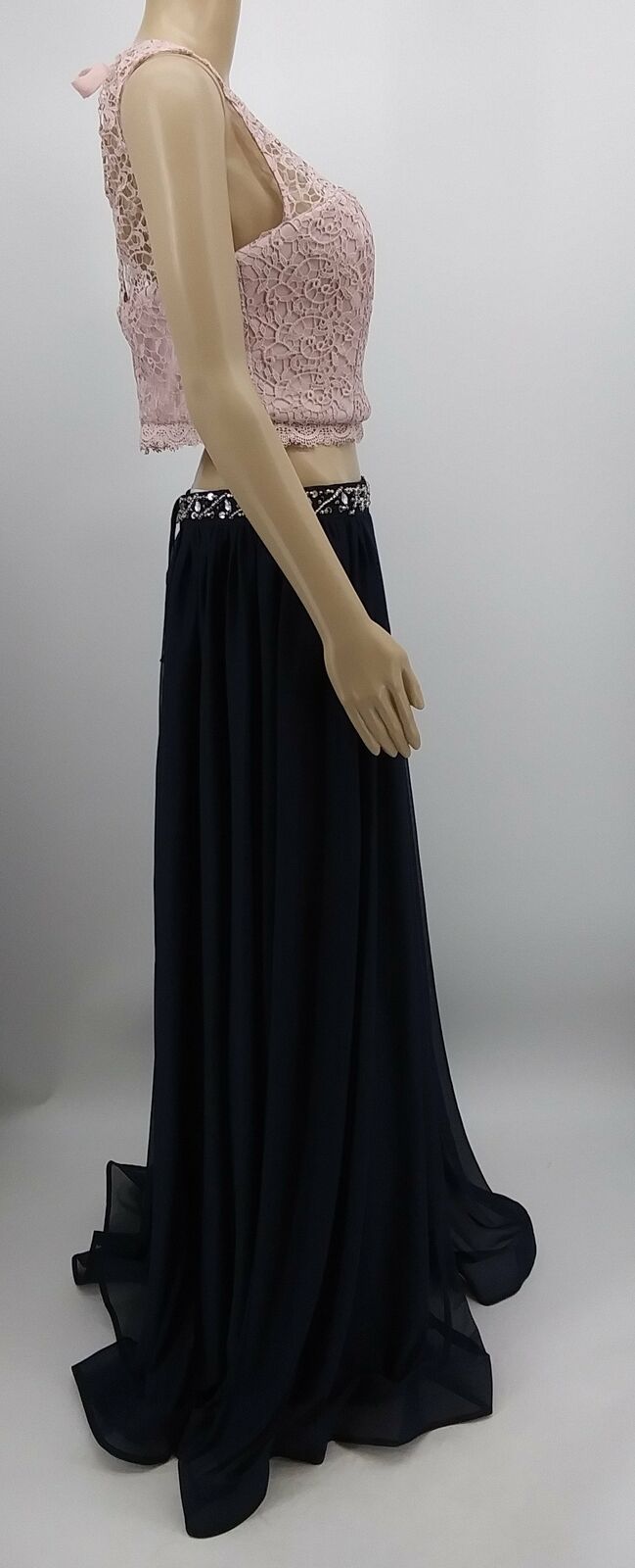Sequin Hearts pretty two-piece gown stars a sequin-scattered lace crop top and floral-print skirt for style.