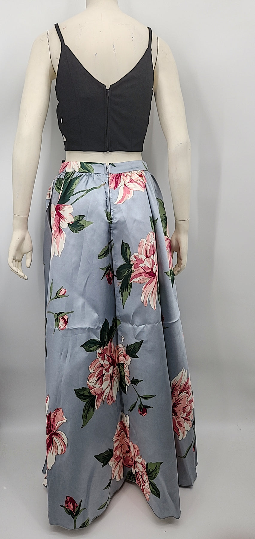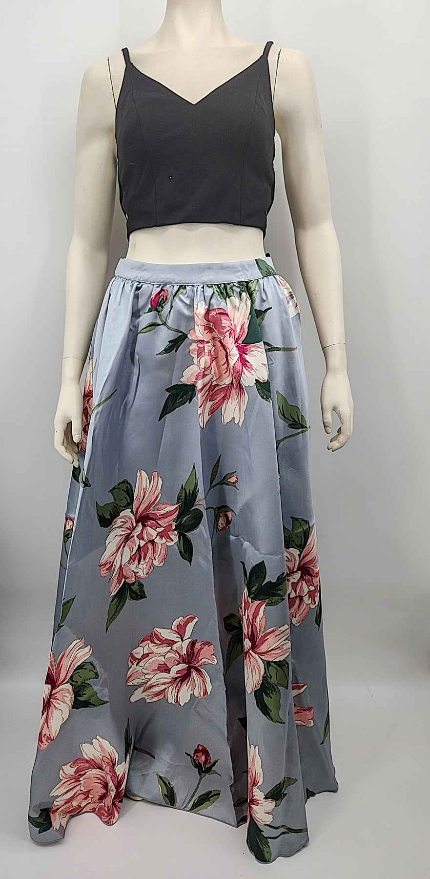 Speechless two-piece formal gown offers pretty romance in floral-strewn satin with pockets. Approx. model height is 510 and she is wearing a size 7 Approx. 61 long from center back to hem. Length is based on size 7 and varies approx. 5/8 between sizes. V-neck Exposed back zipper at top; hidden back zipper at skirt Two-piece design: strappy back crop top and skirt with pockets Molded cups Find the perfect fit in Juniors to Women’s size equivalents: 3=0, 5=2, 7=4, 9=6, 11=8, 13=10, 15=12, 17=14 IMPORTANT NOTE: This