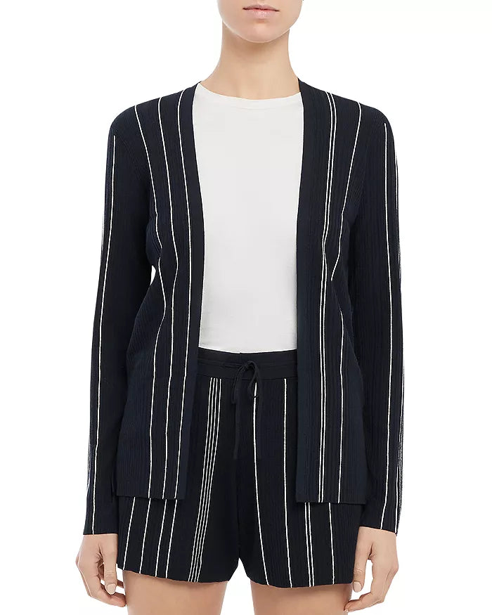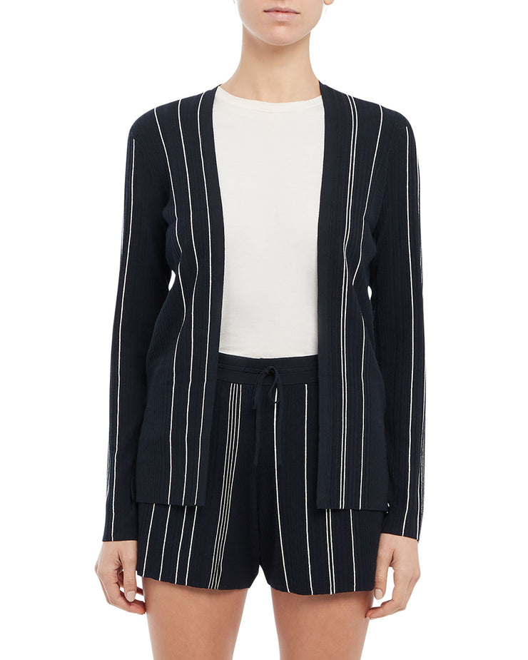 Theory striped cardigan. Open front. Long sleeves. Relaxed fit. Viscose/polyester. Dry clean. Imported. Fits true to size, order your normal size Model measurements: 510 height, 33.5 bust, 23.5 waist, 34.5 hips, wearing a size small Collarless Open front Long sleeves Striped Imported MATERIAL & CARE 90% viscose/10% polyester Dry clean