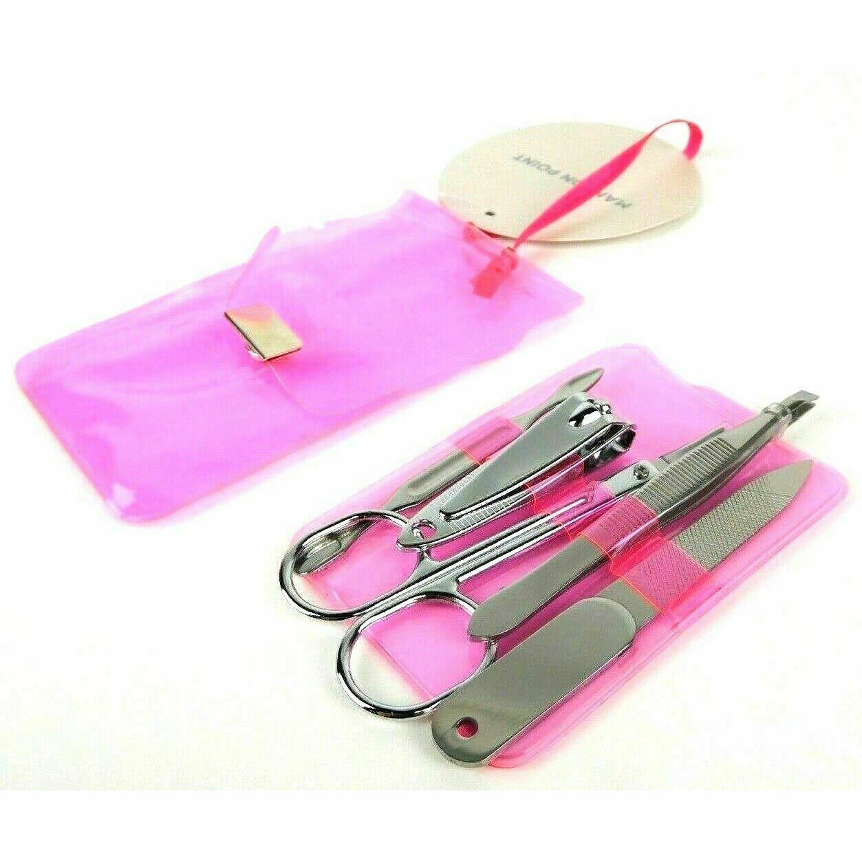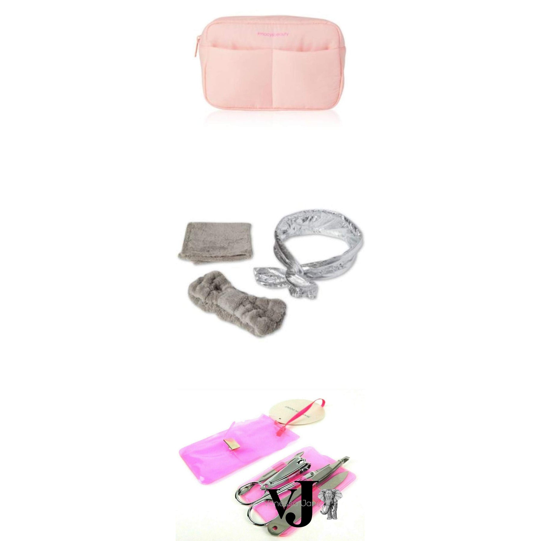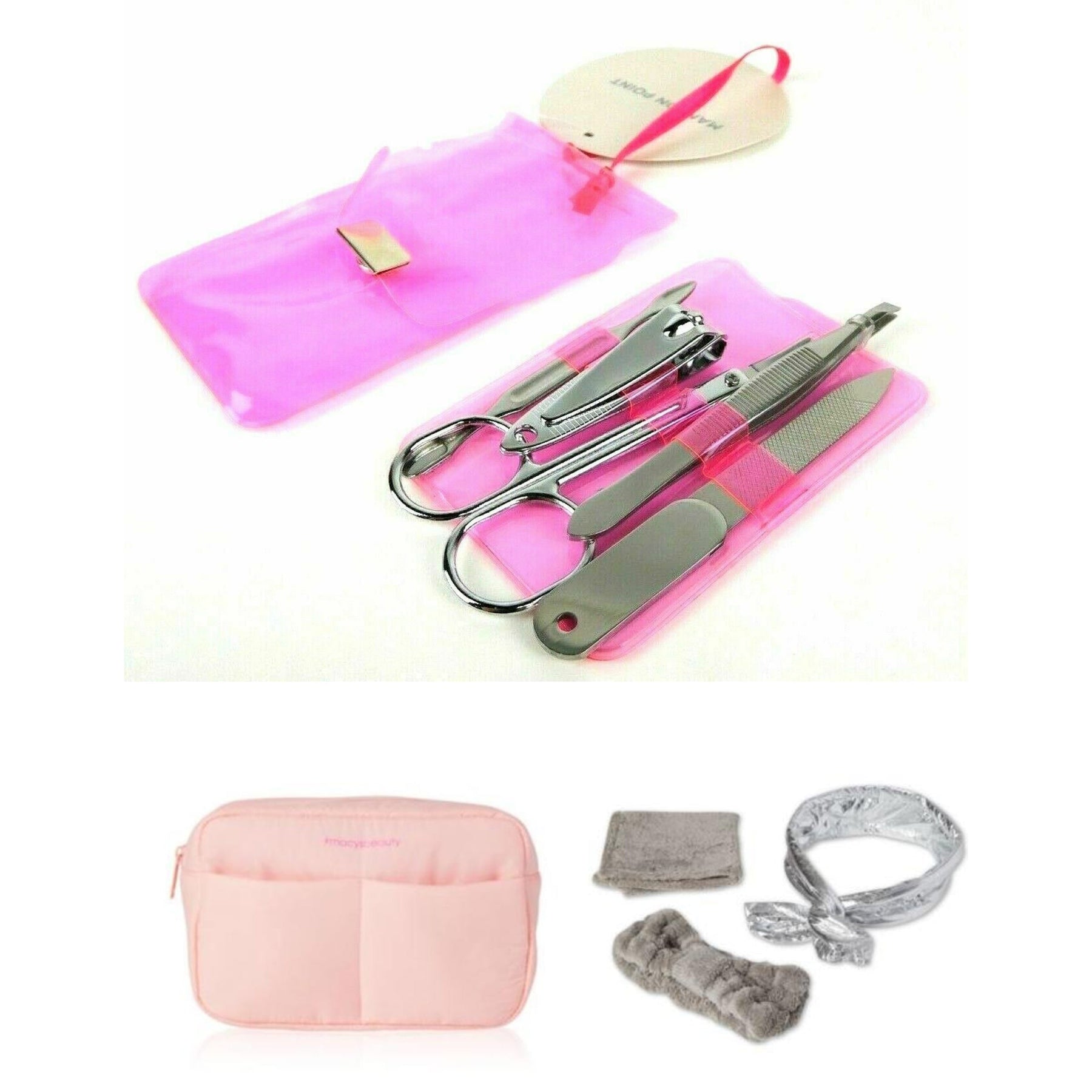 Includes these essential self-care items: Impulse Beauty Collection Pink Cosmetic Bag 3 Pc Wash The Day Away Set: Grey Headband, Washcloth, Wire Headband 5 Piece Nail Set