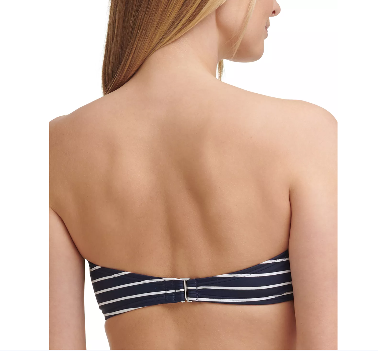 TOMMY HILFIGER Womens Swimwear Striped Bandeau. Classic stripes and center-bust halter straps give Tommy Hilfigers bikini top a cool look for the beach or the pool. Back hook closure; center halter self-tie straps Imported Lined Bandeau neckline; ruched at center Materials & Care Hand wash Nylon/spandex; lining: nylon/spandex