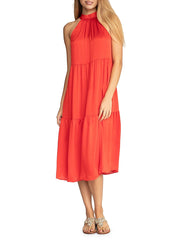Lightweight georgette is saturated in pink and red hues, an instant summer pick-me-up, no matter the weather. Playful tiers and a chic, high neckline blend feminine grace with elevated style, making this the most coveted MIDI dress every woman wants this summer. **Banded high neck*Closure at back neck*Sleeveless*Tiered MIDI silhouette*Length: 55*Model is 510, wearing size S* *Satin Crinkle Georgette**100% Polyester*Hand wash cold or dry clean*Imported* COLOR : LAVA SIZE : S.