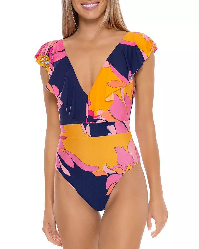 Swimwear sizing fits smaller than apparel sizing, order one size up for more coverage Model measurements: 510 height, 33.5 bust, 23.5 waist, 34.5 hips, wearing a size small PRODUCT DETAILS V-neck with flounced ruffle trim Sleeveless Seamed waist Low back with center band detail Pull-on style No padding Moderate bottom coverage Imported MATERIAL & CARE Self: 83% nylon/17% spandex; lining: 100% nylon Hand wash