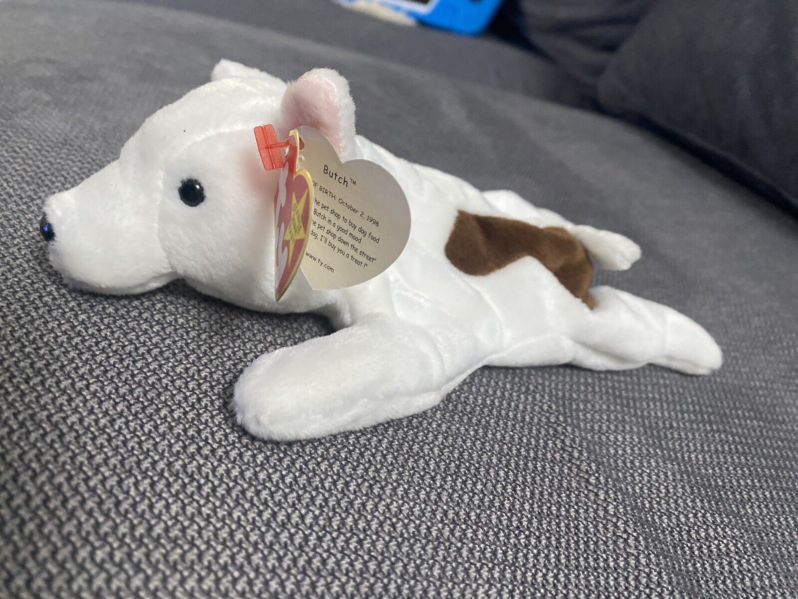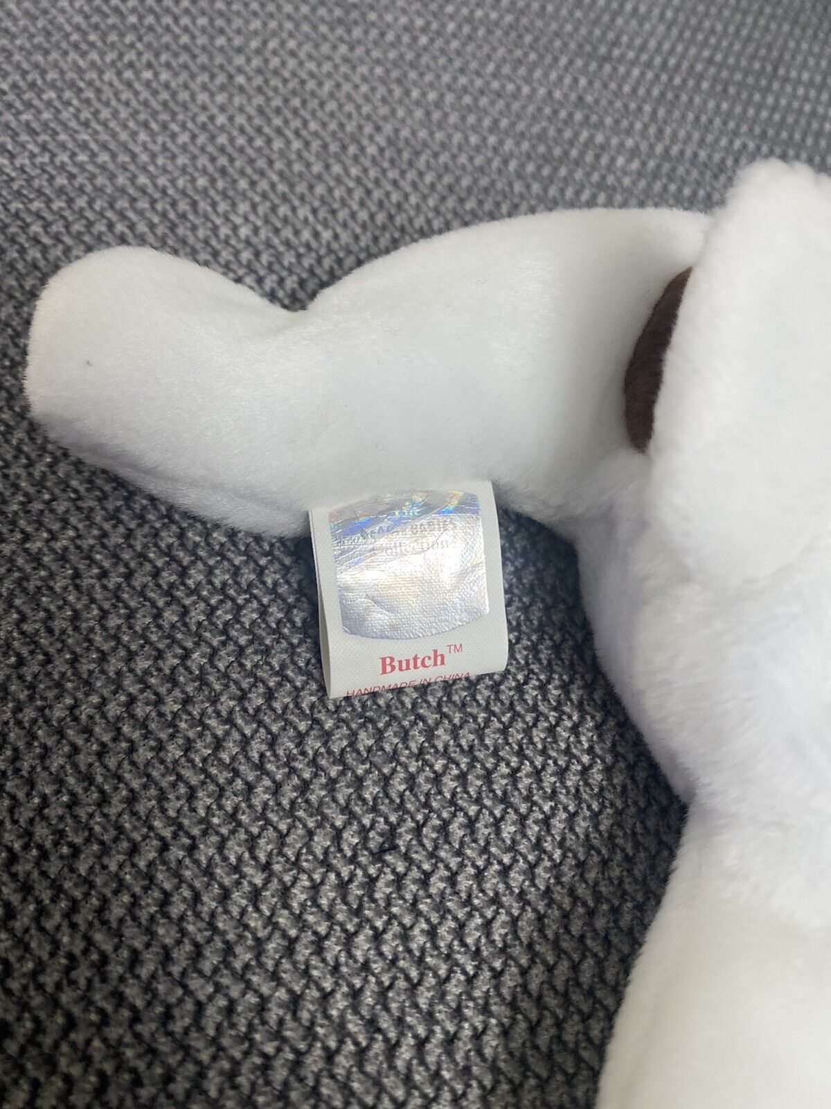 Butch is a part of the Ty Beanie Babies product line. This plush toy comes with all its original tags in mint condition. Snag Butch today! It s the perfect Dog to give your kids your friends or a TY collector. Great for Birthdays Easter Baskets Christmas gifts and more! Ty Beanie Baby Retired Butch the Dog TAG ERRORS / Misspelling 1998 / 1999 RARE. TY Beanie Babies Collectors Rare Butch The Dog With Tag Errors. Errors: 1. Gosport misspelled as Gasport. 2. Space between treat and ! In the last line of the poem. 3. Swing tag says 1998 tush tag says 1999 Comes with hologram tush tag.