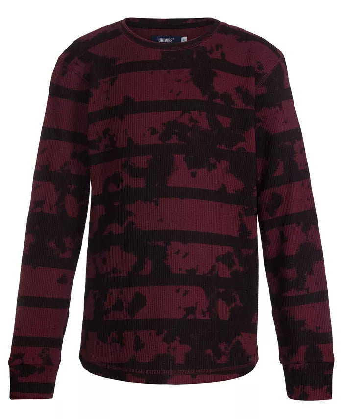 Univibe combines the comfort of thermal fabric with a current tie-dye and stripe pattern. Long sleeve Thermal knit fabric Splatter print pattern Crew neck Cotton/polyester Machine washable Imported