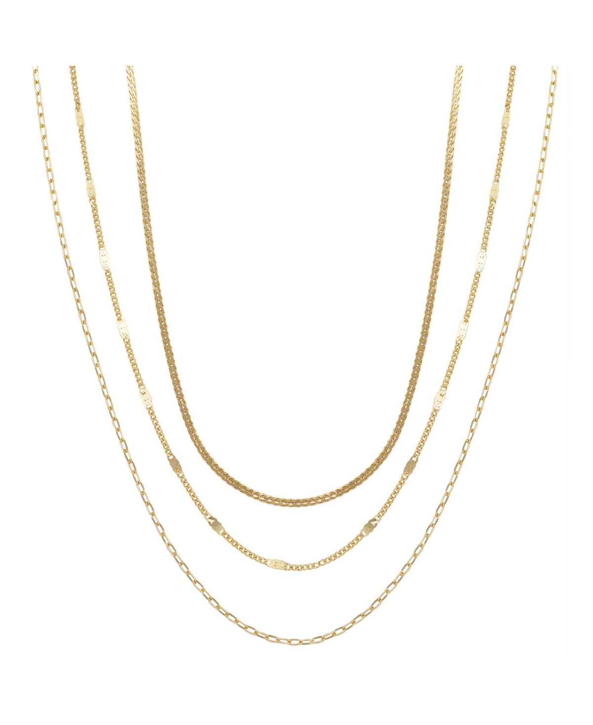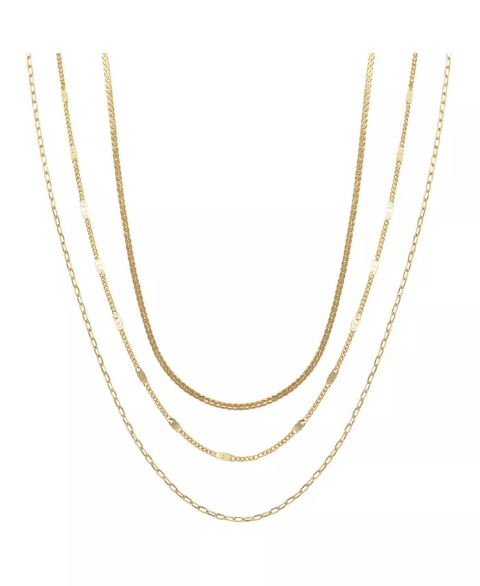 Simple chains make big statements with these layers from Unwritten. Separate clasps allow you to wear one or layer all three. Set in 14K gold flash plated brass metal Chain lengths: 16+ 2, 17+ 2, 18+ 2extender Spring ring closure Set includes- 3 chains Item comes in a box Wipe clean with jewelry cloth Imported Photo may have been enlarged and/or enhanced.