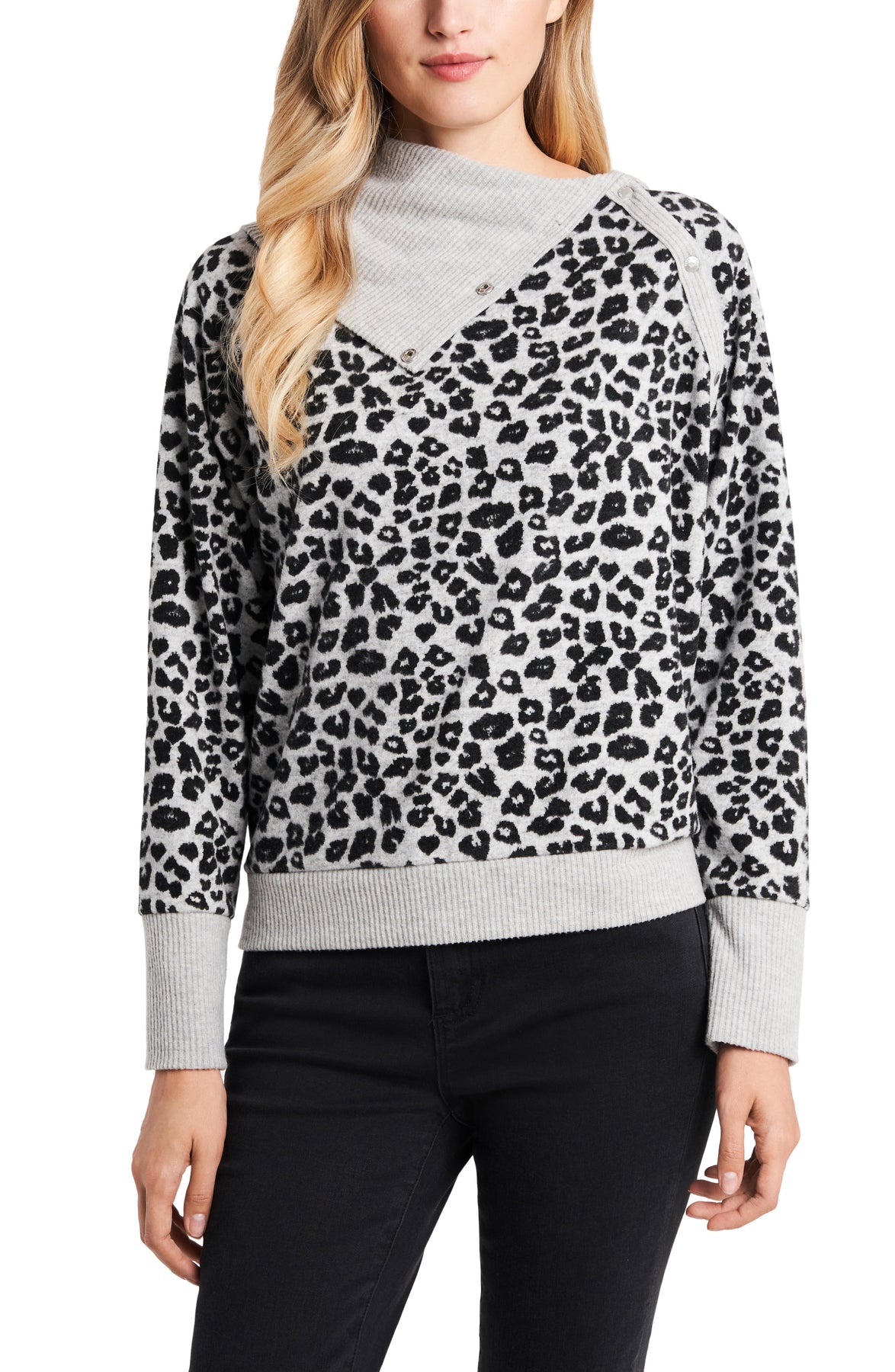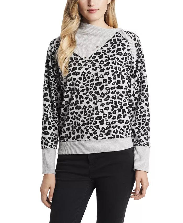 Update your weekend look with Vince Camutos fold over neck top. Leopard jacquard print and modern snap details make this an effortless choice to complete your outfit. Length- 23 Fold over neck Pullover style Long sleeves Polyester, Rayon, Spandex Machine Washable Imported