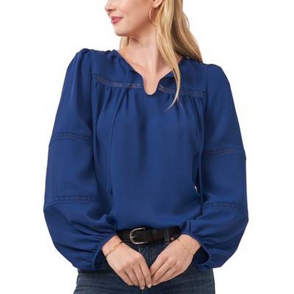 Dainty crochet insets accent the yoke of this tie-neck top with a voluminous, poetic silhouette. 100% polyester Machine wash, line dry Imported. A retro-inspired top from Vince Camuto, pair it with jeans and boots for a chic casual finish. Model is wearing a size small Approx. 24-1/2 long from back Crewneck; tie detail at keyhole front Shirred at yoke; knit-insets throughout Polyester Machine washable Imported
