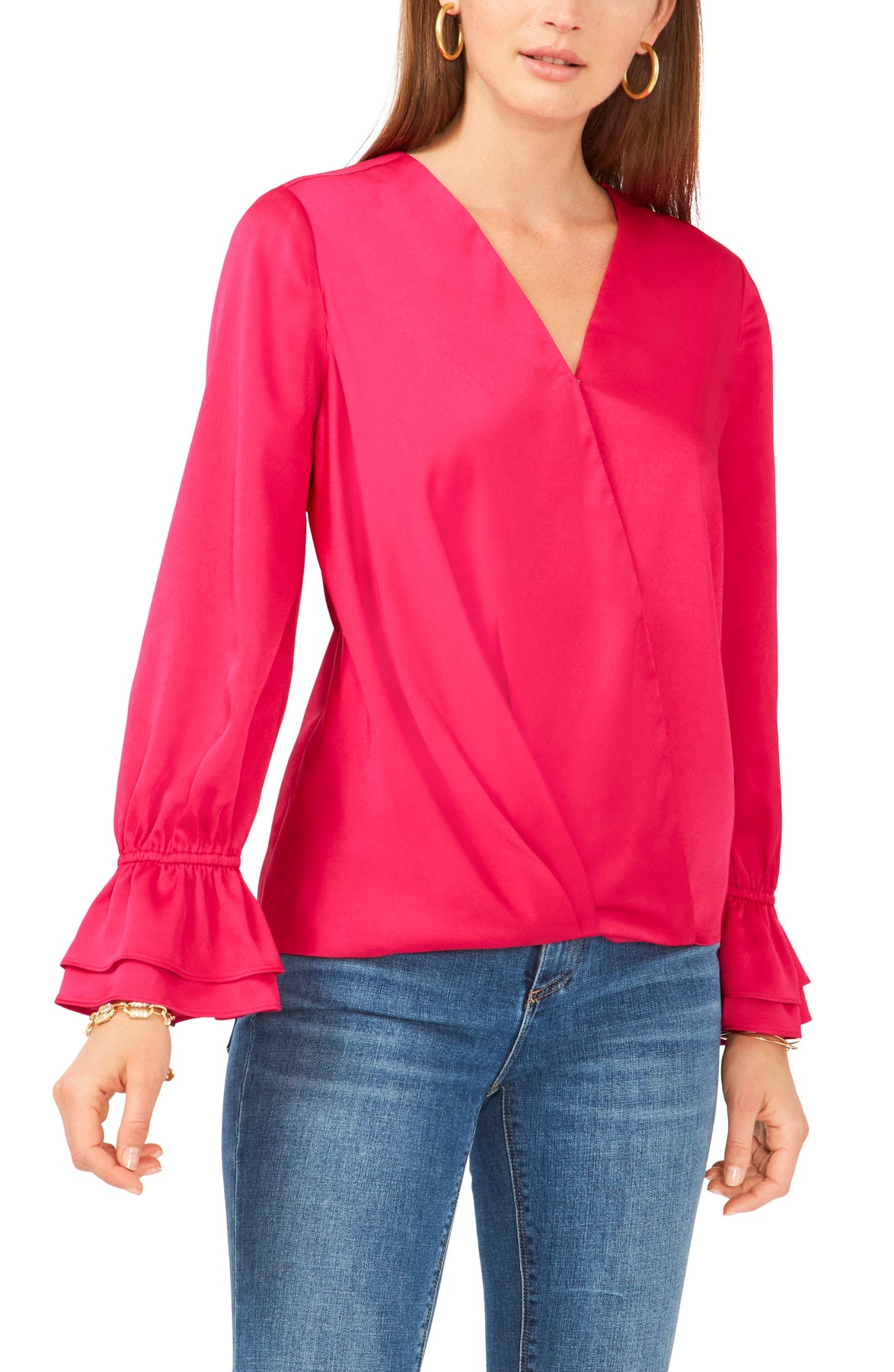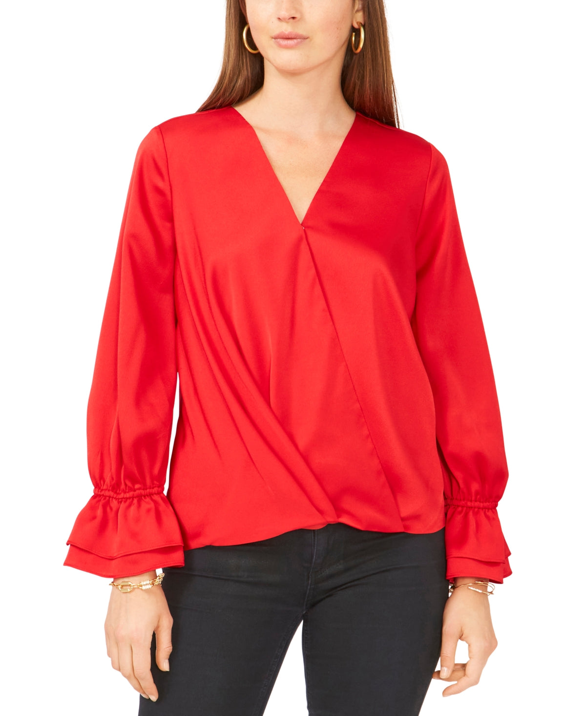 Perfect for the office or the weekend, this surplice top from Vince Camuto features ruffled cuffs for added style. Model is wearing size small Approx. 27 long Surplice neckline; snap at front crossover Pleated detail at front Long sleeves with ruffled cuffs Polyester Machine washable Imported