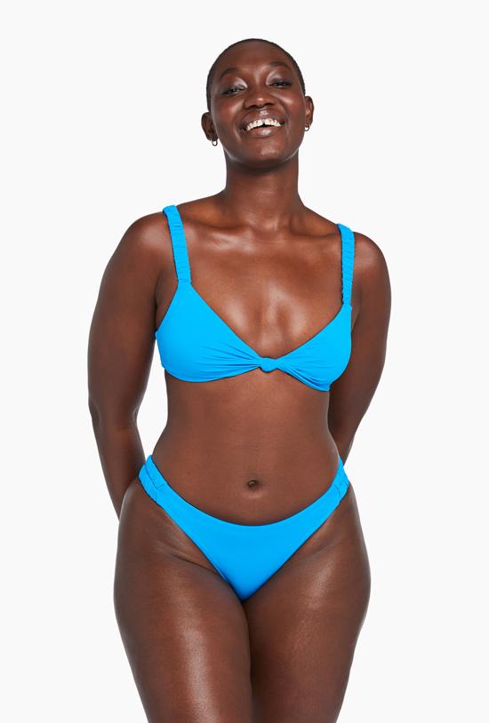 This is a top only, coordinating bottom sold separately Color/pattern: cerulean Design details: knotted front, elasticized shoulder straps Self-tie back straps 83% recycled nylon, 17% spandex Hand wash Made in the USA.